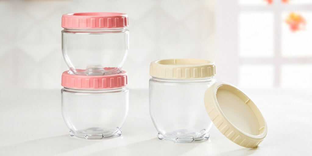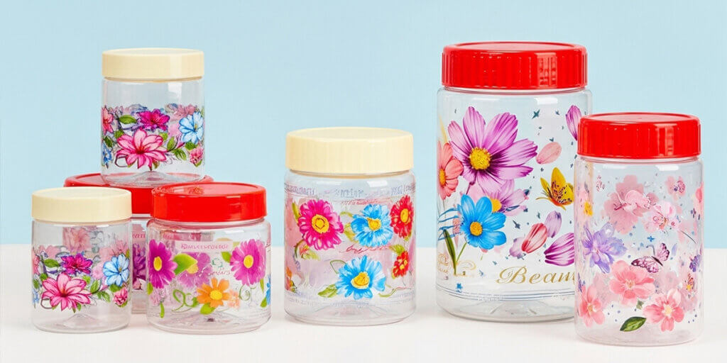 - Jars: Styled in a kitchen environment filled with colorful snacks, pulses, and spices.